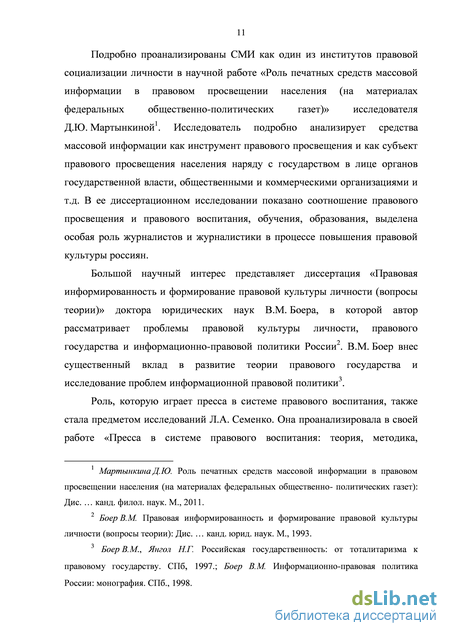 Объектом исследования являются газетные публикации на темы права и законодательства, ориентированные на представителей малого и среднего бизнеса, а также их структура и содержание в разные периоды экономического развития России. Предметом исследования является состояние правовой журналистики, ориентированной на читательскую аудиторию в лице субъектов малого и среднего бизнеса, на современном этапе в системе средств массовой информации РФ. Цель исследования – выявить принципы взаимодействия правовой журналистики и правовой культуры субъектов малого и среднего бизнеса; определить особенности правовых публикаций, рассчитанных на предпринимателей; проанализировать основные этапы развития правовой журналистики в постсоветской России; выявление место правовой журналистики в системе российских СМИ. Для реализации поставленной цели в диссертационном исследовании решены следующие задачи: 1) рассмотреть состояние правовой культуры субъектов малого и среднего бизнеса; 2) выявить источники правовой информации для субъектов малого и среднего бизнеса; 3) установить актуальность СМИ как источника правовой информации для предпринимателей; 4) проанализировать деловые и общественно-политических газеты на наличие публикаций на темы права и законодательства; 5) изучить состав читательской аудитории правовых публикаций в СМИ; 6) определить основные типологические особенности публикаций на темы права и законодательства в зависимости от статуса правового акта; 7) выявить долю публикаций на темы законодательства и права, ориентированных на бизнес, в общем объеме журналистских произведений в разные периоды времени (1993, 2003, 2013 гг.); 8) выявить основные темы, актуальные для предпринимателей в разные периоды времени.