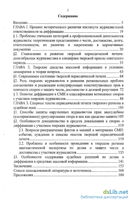 Структура диссертации обусловлена целью и задачами исследования, логикой изложения материала. Диссертация состоит из введения, трех глав, включающих восемь параграфов, заключения, списка литературы и приложений, в качестве которых представлены: классификация возможных диффамационных споров с участием тверских журналистов, основанная на изучении конфликтных ситуаций в связи с ущемлением чести, достоинства и деловой репутации; положение о проведении лингвистических экспертиз и заключений по документационным и информационным спорам, в соответствии с которым учеными-русистами филологического факультета ТвГУ осуществляется анализ спорных текстов на предмет наличия в них признаков диффамации; заключение лингвистической экспертизы (экспертное заключение) по поводу диффамации, проведенной специалистами Тверского государственного университета; перечень типовых вопросов, которые могут быть поставлены на разрешение лингвистической экспертизы, выявленных в результате изучения и анализа спорных текстов СМИ, проверенных профессорами - экспертами ТвГУ на предмет содержания в них сведений, порочащих честь, достоинство и деловую репутацию, а также перечень практических рекомендаций работникам тверских средств массовой информации, способствующих избежанию конфликтных
