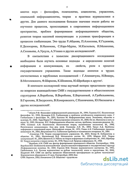 многих наук - философии, политологии, социологии, управления, социальной информациологии, теории и практики журналистики и других. Для данного исследования большое значение имели работы по изучению процессов, происходящих в современном информационном пространстве, проблем формирования информационного общества, развития теории массовой коммуникации в условиях трансформации и процессов глобализации. Это труды Р.Абдеева, П.Алексеева, К.Гаджиева, К.Делокарова, В.Налимова, С.Кара-Мурзы, М.Кастельса, И.Мелюхина, А.Соловьева, А.Урсула, А.Уткина и других исследователей4.