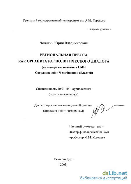 Предметом исследования является деятельность региональной прессы по организации политического диалога власти и общества.
