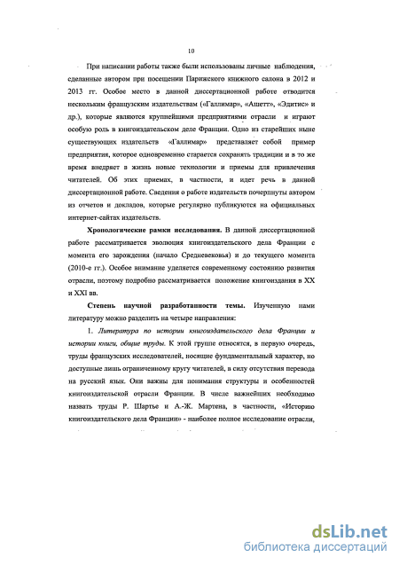 Хронологические рамки исследования. В данной диссертационной работе рассматривается эволюция книгоиздательского дела Франции с момента его зарождения (начало Средневековья) и до текущего момента (2010-е гг.). Особое внимание уделяется современному состоянию развития отрасли, поэтому подробно рассматривается положение книгоиздания в ХХ и ХХI вв.