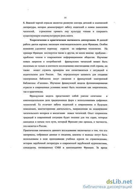 Рабочая гипотеза настоящей диссертационной работы. В данной диссертационной работе автор выдвигает следующую рабочую гипотезу: к началу XXI в. во Франции сложилась жизнеспособная модель функционирования книгоиздательской отрасли, в рамках которой возможно дальнейшее развитие и сосуществование различных типов книг, синтез традиций и новых технологий. Книгоиздательское дело Франции сейчас переживает этап модернизации и совершенствования, сохраняя все достижения, накопленные за несколько веков существования. Издатели активно внедряют в жизнь цифровые технологии, развивают секторы электронной, печатной, аудиокниги.