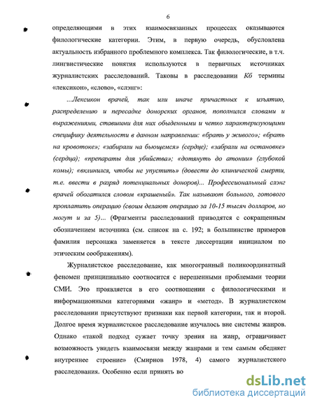 ...Лексикон врачей, так или иначе причастных к изъятию, распределению и пересадке донорских органов, пополнился словами и выражениями, ставшими для них обыденными и четко характеризующими специфику деятельности в данном направлении: «брать у живого»; «брать на кровотоке»; «забирали на бьющемся» (сердце); «забрали на остановке» (сердца); «препараты для убийства»; «дотянуть до атонии» (глубокой комы); «вклинился, чтобы не упустить» (довести до клинической смерти, т.е. ввести в разряд потенциальных доноров)... Профессиональный слэнг врачей обогатился словом «крашеный». Так называют больного, готового проплатить операцию (своим делают операцию за 10-15 тысяч долларов, но могут и за 5)... (Фрагменты расследований приводятся с сокращенным обозначением источника (см. список на с. 192; в большинстве примеров фамилия персонажа заменяется в тексте диссертации инициалом по этическим соображениям).