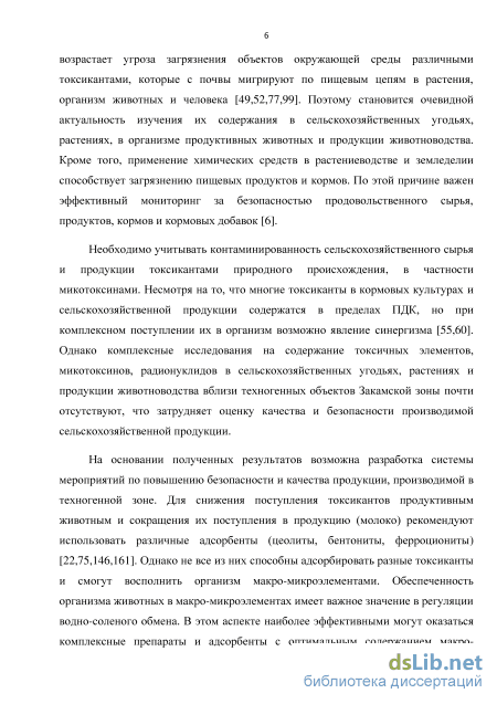 Влияние на человека и животных вредных факторов вызывают постоянную мобилизацию компенсаторно-защитных механизмов организма, резервы которых ограничены. Поэтому интенсивное и длительное воздействие ксенобиотиков могут приводить к снижению систем адаптивных процессов гомеостаза организма (П.Д. Горизонтова, 1981; В.П. Нефедов и др.,1991). В этом аспекте важной задачей является мониторинг качества и безопасности кормов и продовольственного сырья растительного и животного происхождения на содержание биологических и абиотических токсикантов (А.М. Алимов и др.,2012). Вблизи промышленных зон наиболее распространенными ксенобиотиками являются токсичные элементы. Кроме того, представляют реальную угрозу здоровью людей и животных микотоксины и радионуклиды. Однако комплексные исследования на содержание токсических элементов, микотоксинов, радионуклидов в сельхозугодиях, растениях и продукции животноводства вблизи техногенных объектов Закамской зоны почти отсутствуют, что затрудняет оценку качества и безопасности производимой сельскохозяйственной продукции.