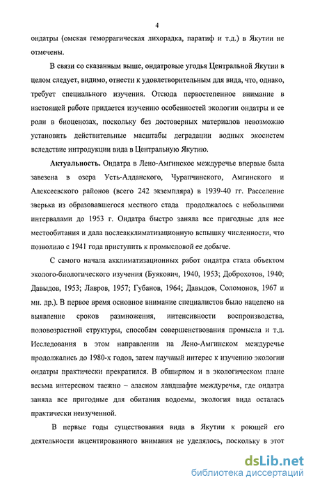 В связи со сказанным выше, ондатровые угодья Центральной Якутии в целом следует, видимо, отнести к удовлетворительным для вида, что, однако, требует специального изучения. Отсюда первостепенное внимание в настоящей работе придается изучению особенностей экологии ондатры и ее роли в биоценозах, поскольку без достоверных материалов невозможно установить действительные масштабы деградации водных экосистем вследствие интродукции вида в Центральную Якутию.