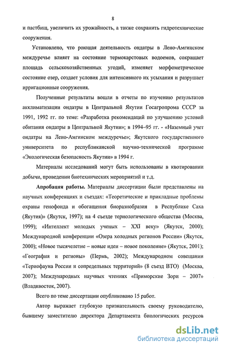 Апробация работы. Материалы диссертации были представлены на научных конференциях и съездах: «Теоретические и прикладные проблемы охраны генофонда и обогащения биоразнобразия в Республике Саха (Якутия)» (Якутск, 1997); на 4 съезде териологического общества (Москва, 1999); «Интеллект молодых ученых - XXI веку» (Якутск, 2000); Международной конференции «Озера холодных регионов России» (Якутск, 2000); «Новое тысячелетие - новые идеи - новое поколение» (Якутск, 2001); «География и регионы» (Пермь, 2002); Международном совещании «Териофауна России и сопредельных территорий» (8 съезд ВТО) (Москва, 2007); Международных научных чтениях «Приморские Зори - 2007» (Владивосток, 2007).