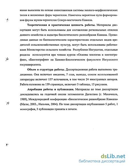 Теоретическая и практическая ценность работы. Материалы диссертации могут быть использованы для составления региональных списков данного семейства и кадастра биологического разнообразия Кавказа. Приводимыедан-ные по биоэкологическим характеристикам отдельных видов вредителей сельскохозяйственных культур, могут быть использованы работниками Министерства сельского хозяйства Республики Ингушетии, отдельные разделы используются при чтении курсов «Основы зоологии и зоогеографии», «Биогеография» на Химико-Биологическом факультете Ингушского госуниверситета.