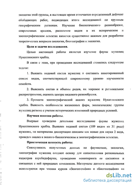 Научная новизна работы. Впервые проведено детальное исследование фауны жужелиц Нукатлинского хребта. Выявлен видовой состав (109 видов из 31 рода) жужелиц, по материалам диссертации описаны как новые для науки 2 вида, проведен анализ в эколого-биологическом и зоогеографическом аспектах.