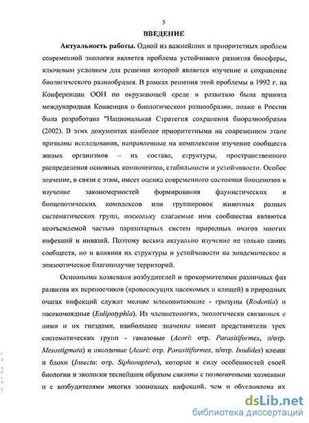 Основными хозяевами возбудителей и прокормителями различных фаз развития их переносчиков (кровососущих насекомых и клещей) в природных очагах инфекций служат мелкие млекопитающие - грызуны (Rodentia) и насекомоядные (Eulipotyphla). Из членистоногих, экологически связанных с ними и их гнездами, наибольшее значение имеют представители трех систематических групп - гамазовые (Acari: отр. Parasitiformes, п/отр. Mesostigmata), иксодовые (Acari: отр. Parasitiformes, п/отр. Ixodides) клещи и блохи (Insecta: отр. Siphonaptera), которые в силу особенностей своей биологии и экологии теснейшим образом связаны с позвоночными хозяевами и с возбудителями многих зоонозных инфекций, чем и обусловлена их эпизоотическая и эпидемическая роль в природных очагах (Балашов, 1967; 1998; Алексеев, Балашов, 1985; Ващенок, 1988; Тагильцев, 1975). Однако, несмотря на долгую историю изучения мелких млекопитающих и связанных с ними членистоногих в Сибири, многие вопросы, касающиеся отдельных видов и региональных особенностей их распределения, структуры популяций и формируемых ими сообществ, остаются еще недостаточно изученными, а обобщающих работ, включающих сравнительный анализ данных по всей Западной Сибири очень мало. К настоящему времени проведена детальная инвентаризация фауны мелких млекопитающих Западно-Сибирской равнины (Равкин и др., 1996; 1997; 2002), активно изучаются их сообщества (Галкина, 1980; Ердаков и др., 1980; Сообщества ….., 1978; Вартапетов, 1982; Литвинов, 1998; 2001; 2004), описаны фаунистические комплексы гамазовых (Зуевский, 1981; Давыдова, Никольский, 1986) и иксодовых клещей (Алифанов и др., 1970; 1973; 1974), а также зональные типы населения кровососущих клещей и блох (Богданов, 1990). Но комплексного изучения сообществ мелких млекопитающих и связанных с ними паразитических членистоногих в Западной Сибири практически не проводилось, в частности – не изучались состав и структура образуемых ими единых паразито-хозяинных комплексов.